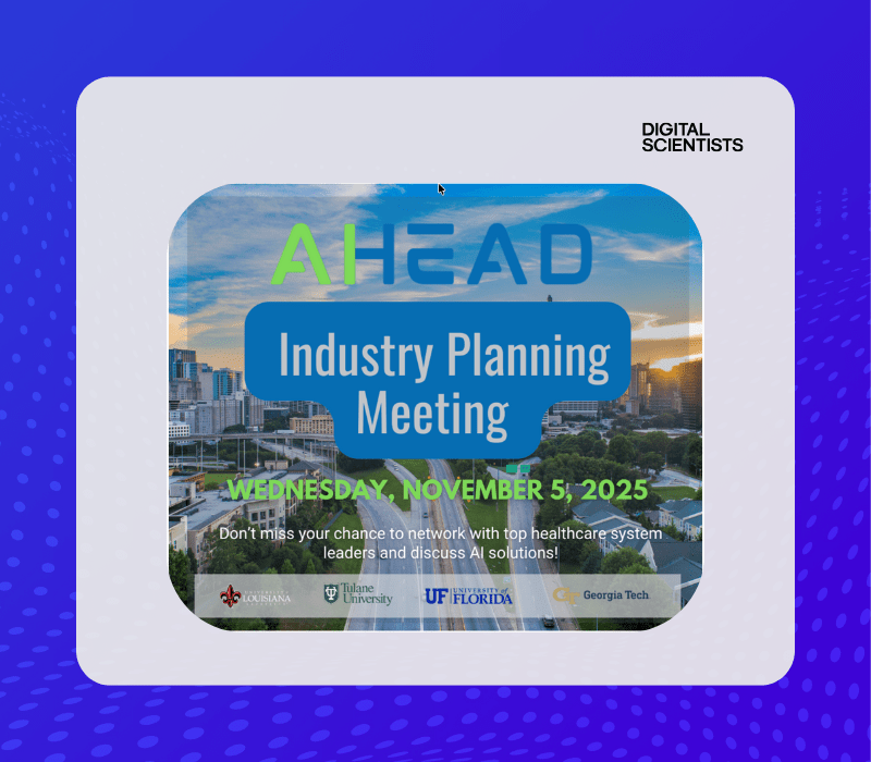 We’re excited to share that Bob Klein, CEO of Digital Scientists, will be attending the AHeAD Center Planning Meetings at Georgia Tech in Atlanta, GA. Hosted by the Accessible Healthcare through AI-Augmented Decisions (AHeAD) Center, this event brings together healthcare leaders, researchers, and industry partners to shape the vision for a new NSF Industry–University Cooperative